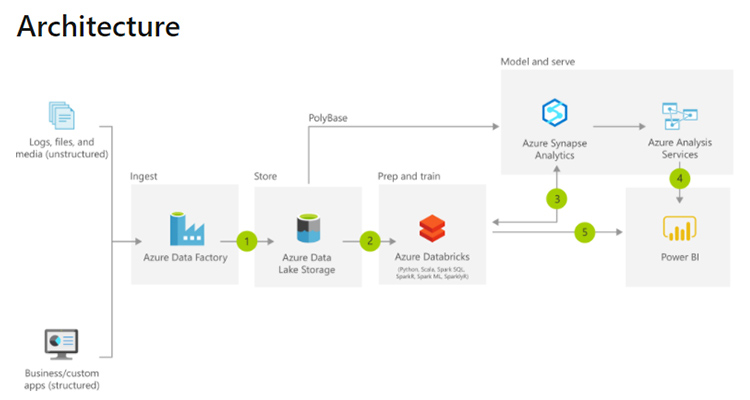 ETL処理では Azure Databrics、Visualizeでは Power BIの利用が推奨されていますが、Storeから伸びている「PolyBase」の矢印の通り、PolyBaseまたは COPYコマンドを利用することで、Azure Synapse Analyticsは直接Data Lake Storageへアクセス可能ですし、この後解説する、PySparkを利用した視覚化も実現することができます。
