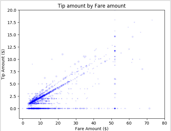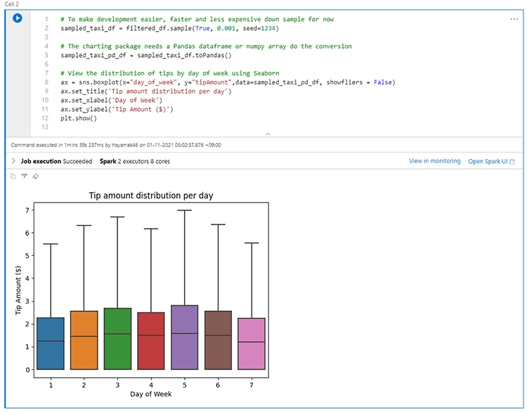 実際に試してみると、以下チュートリアルのように、たった10行にも満たないコードで先程のNYCタクシーデータから、曜日とチップの相関を示す箱ひげ図が書けました。