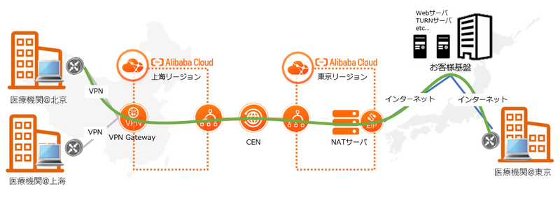 これによって、中国国内はインターネットVPN、日本ー中国間はCENを経由した通信を実現します。Alibaba Cloud東京リージョンに設置したNATサーバを経由してインターネットへ抜けるため、従来の環境を変更することなくお客さまシステム及び、日本国内の医療機関と安定した通信を確立します。