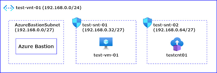 az network vnet subnet create \ --address-prefixes 192.168.0.64/27 \ --name test-snt-02 \ --resource-group test-rg-01 \ --vnet-name test-vnt-01 \ --network-security-group test-nsg-02
