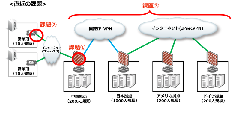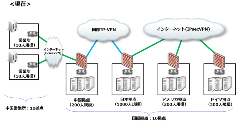 今回のユースケースでは、グローバルに多数拠点をお持ちのお客さまが対象となります。グローバル全体での拠点数は10拠点、中国内での拠点数は中心拠点1か所、小規模10か所を想定します。