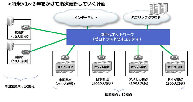 まず最優先事項は中国拠点のセキュリティ維持です。中国ファイアウォールがEOLを過ぎるとセキュリティアップデートができなくなります。物理機器にてリプレイスする場合は計画~入替まで半年はかかるため、早めに決断をする必要があります。 一方で、全体的なゼロトラストモデルへの移行の中で、リプレイスしたファイアウォールを早い段階で手放す可能性があることも考慮に入れておかなくてはいけません。