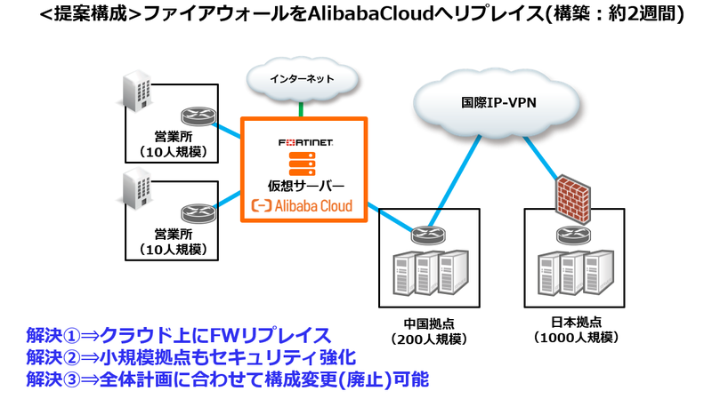 そこで解決策として、従量課金で稼働可能なクラウドファイアウォール(FortigateVM)を提案しました。AlibabaCloud上にFortigateVMを構築し、各拠点とクラウドをIPsecVPNで接続します。中国の各拠点からのインターネットアクセスはクラウド経由となります。