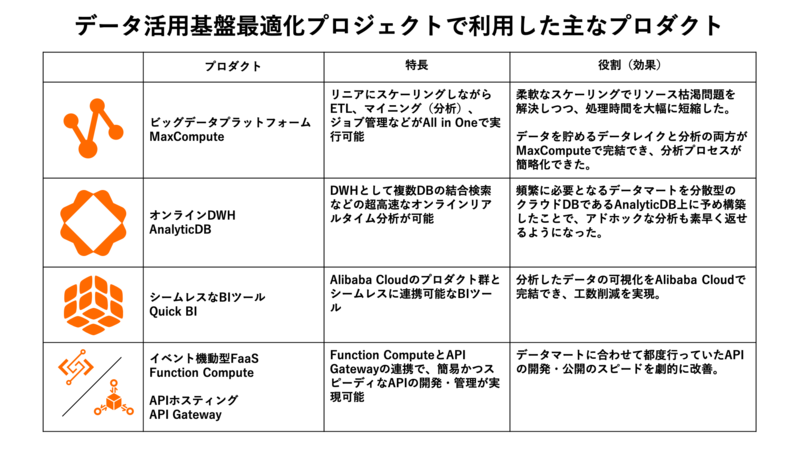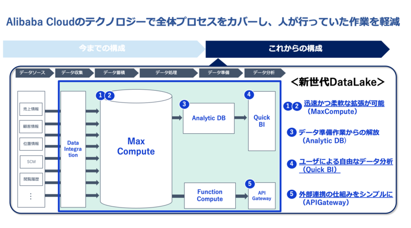 「MaxCompute」で迅速かつ柔軟な拡張を可能にし、負荷を増大させていたデータマート群は「AnalyticDB」を提供することで、データ準備作業から解放しました。また、データ分析については「Quick BI」で不十分だった体制を改善させています このようにデータ収集から蓄積、処理、準備、分析まで全体のプロセスをカバー。人が行っていた作業を軽減し、既存データウェアハウスから新世代データレイクに環境を変えることで課題を解決しました。