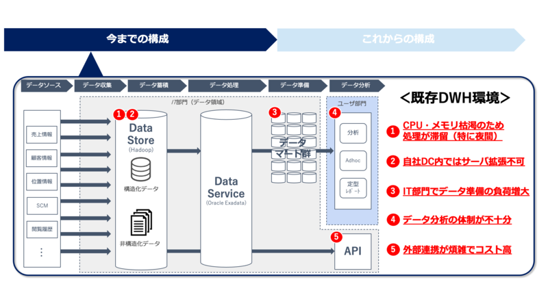 もう一つ紹介したい事例は、データ活用基盤の最適化です。お客さまは、オンプレミス環境でデータ処理・分析基盤を運用していましたが、コスト面とIT部門のデータ準備作業に課題を抱えていました。