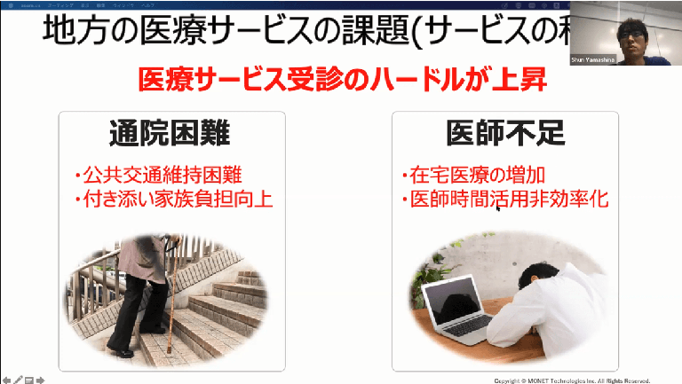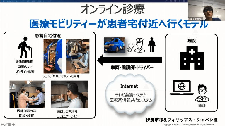 『それらの課題を解決するサービスとして、医療モビリティー、つまり医療機器や看護師を載せた車を患者宅付近へ派遣するというものを提供しています。