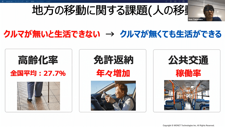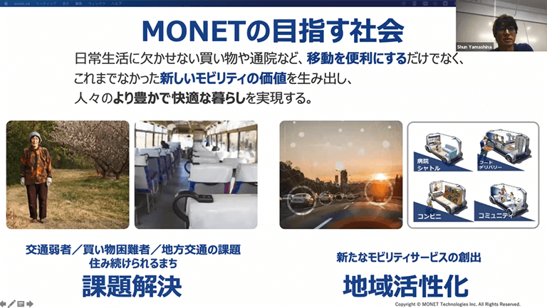 『交通弱者や買い物困難者などが持つ課題を「課題解決」すること、さらに新しいモビリティで日本を元気にしよう(地域活性化)というのがMONETが目指す社会です。』