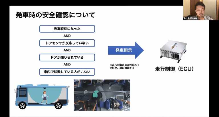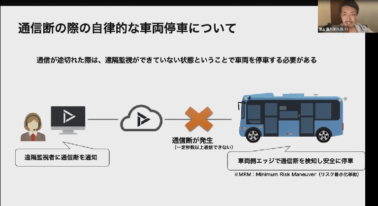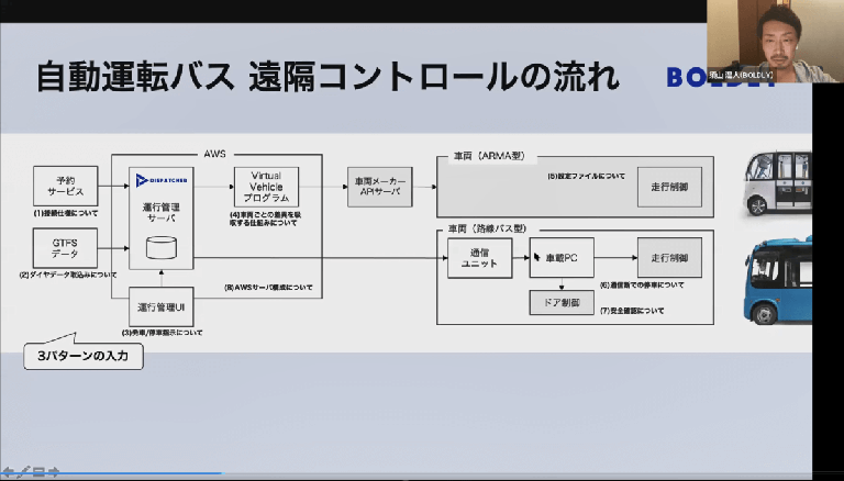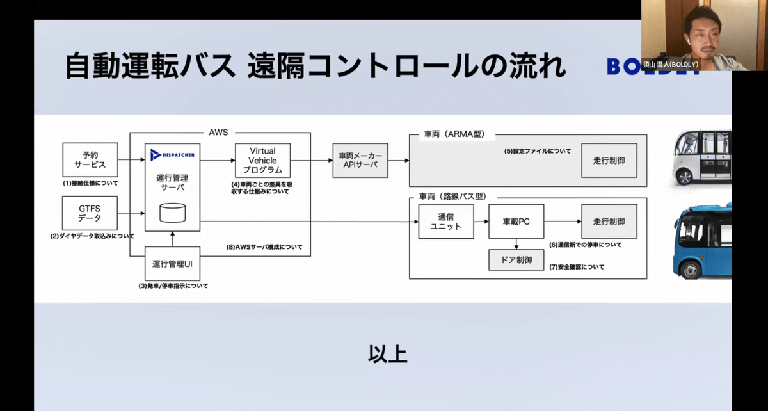 最後に、自動運転バスの遠隔コントロールの流れについて全体の図がもう一度紹介されました。