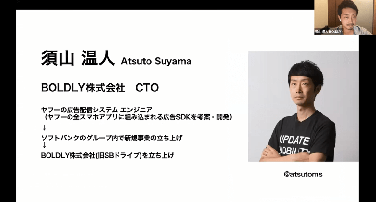 2人目の登壇者はBOLDLY株式会社の須山温人さんです。後から聞いたのですが、ワクチンを打った後で高熱を出しながらの登壇だったようで、見返してみると確かにつらそうな所が見て取れました。改めてありがとうございました。
