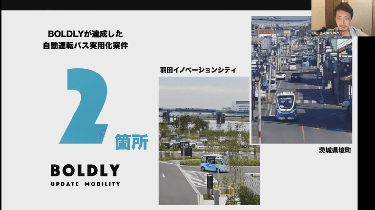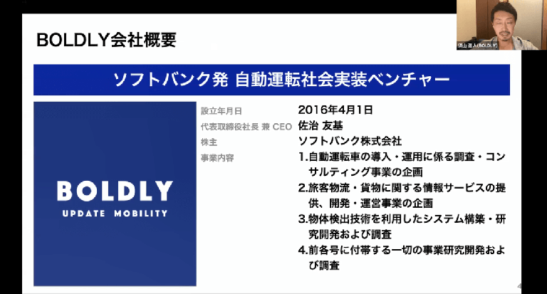 『BOLDLYはソフトバンクの子会社であり、社内で自動運転に取り組む意志のある若手3人が立ち上げた会社です。2016年から約5年間、「自動運転バスをどのようにして社会で使ってもらうか?」という社会実装に挑戦をしています。』