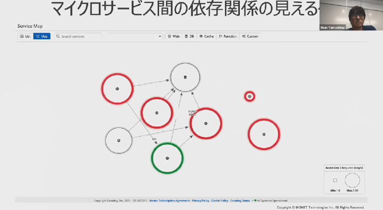 オブザーバビリティ(化観測性)についても話がありました。『マイクロサービスを進めるためには、マイクロサービス間の依存関係の見える化、そして健全性を即時に把握できることが大切。』