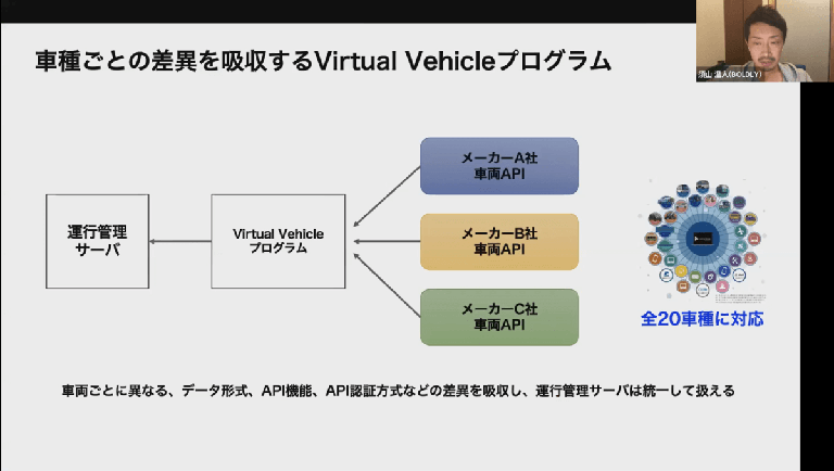 『様々なメーカーの自動運転車に対応するため、Virtual Vehicleプログラムを開発して、複数の車に対応しています。車両ごとに、データ形式、API情報、API認証方式など様々な違いがあるためこのプログラムが必要で、これがある事で、運行情報システムからは統一的に車両を扱うことが可能です。』