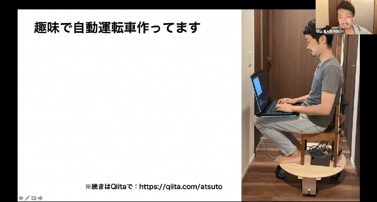趣味でOSSのAutoWareをつかっての自動運転車を作ってるとのことで笑、かなり熱いです。