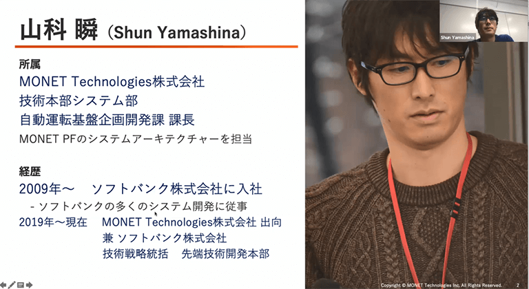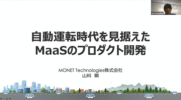 お1人目の発表者はMONETの山科さん。 「自動運転時代を見据えたMaaSのプロダクト開発」というテーマでお話いただきます。