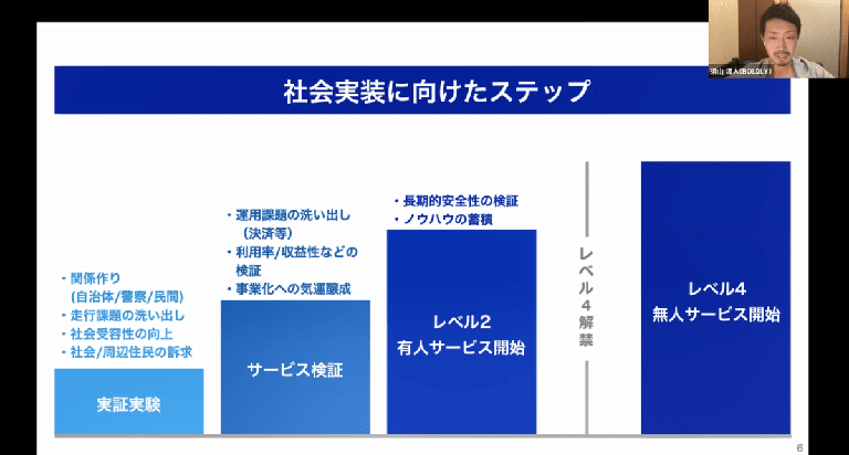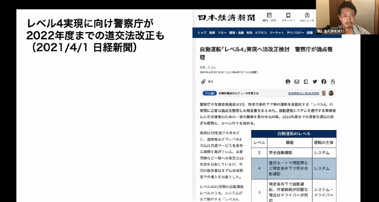『レベル4実現に向けては警察庁も動きを始めていて、2022年度までに道交法をレベル4対応に改正する流れになっているので、来年再来年には法改正されるのではと期待しています。』