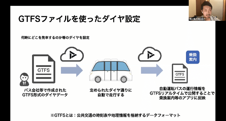 『GTFSはGoogleなどが提唱している公共交通のデータフォーマットで、この形式で作成することによって、定められたダイヤ通りに自動で走行することができます。』