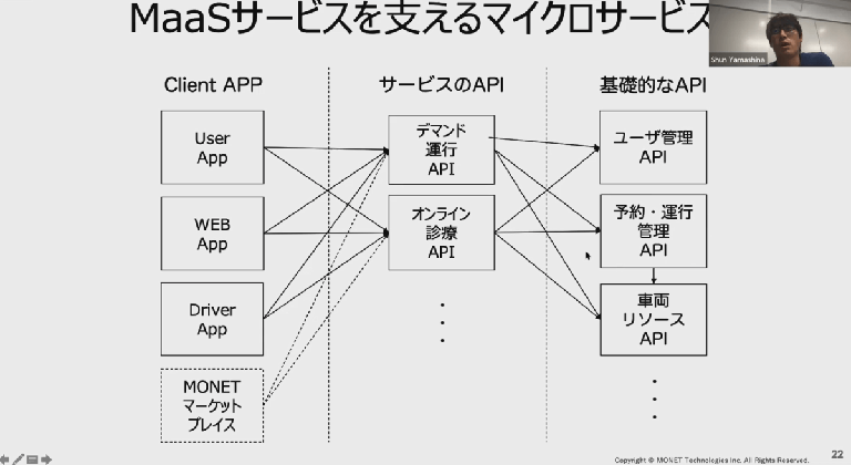 MaaSサービスの裏側も解説してくれました。モノリシックなサービス開発ではなく、APIを組み合わせて疎結合なサービス開発は今どきな手法ですね。