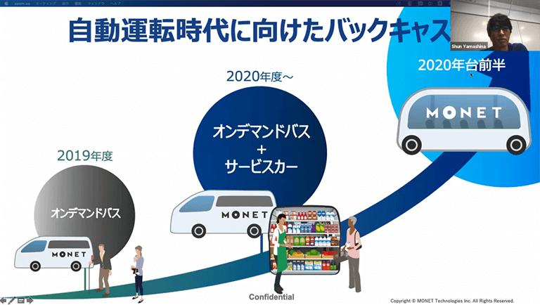 『自動運転車が無い時代から、2019年度オンデマンドバス運行、2020年~人の移動だけで無くサービスの移動を開始し、、そこから自動運転時代に向けた製品開発を行っています。』