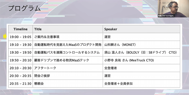 今回のSB Tech Night #3では以下の3人の方にMaaS関連の技術的な話を含めて行っていただきました。それぞれどのような話だったのかをおさらいしてみます。