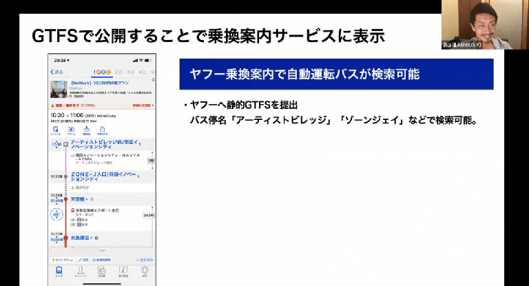 『GTFSで公開することによって、乗り換え案内などで検索が出来るようになります。実際に、ヤフーの乗換案内で自動運転バスが検索可能となっています。おそらく、これは日本初じゃないかと思います』