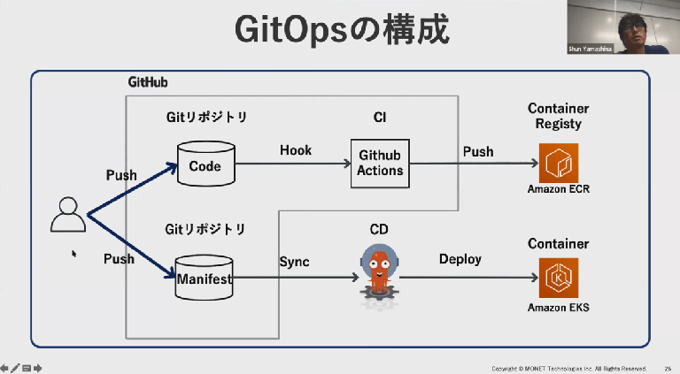 開発はGithubを中心に構成されているそうです。 コンテナレジストリに登録する経路と、EKSへリリースするためのルートが2つあるというのは真似してみようと思いました。