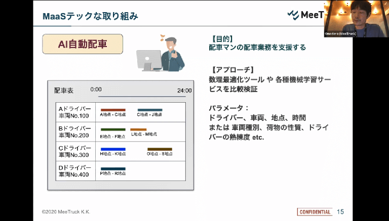 AI自動配車という、運送会社のブレーンでもある、配車マンの業務支援のサービスも開発しています。