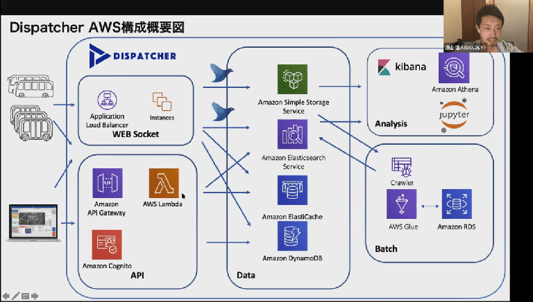 『基本的にはAWSを利用しています。 APIはLambdaを使って、車からの位置情報などリアルタイム通信はWebsocketを私用しています。 車の位置情報などはElasticsearchにいれて分析しやすいようにしています。 ダイヤ情報はDynamoDBに格納して、分析は、Kibanaで可視化をしています。』