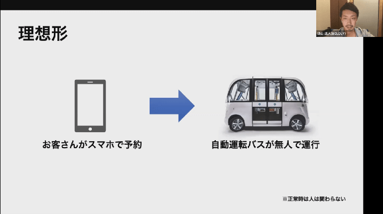 自動運転バスの理想形は、お客さんがスマホで予約をすると、バスが自動でやってきて乗せてくれるという形です。