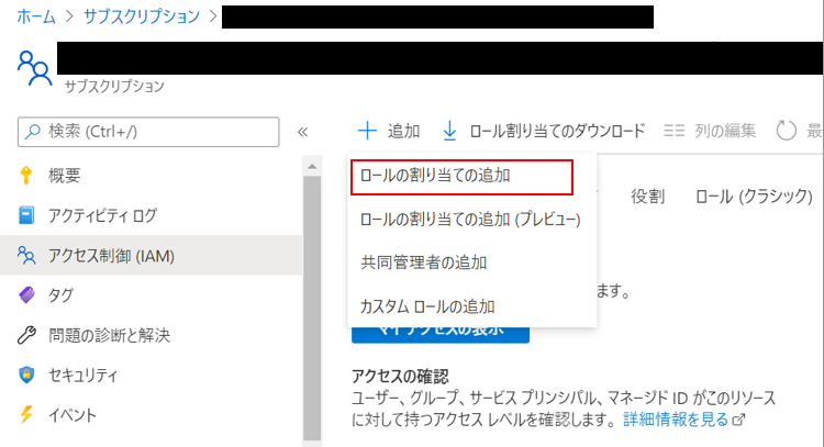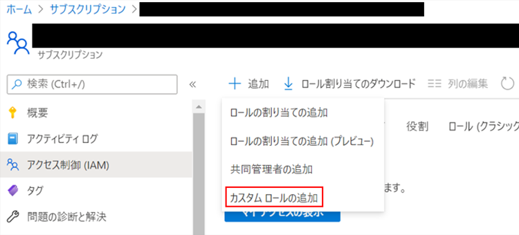 サブスクリプションから、IAMの画面へ移動します。その後、「+ 追加」をクリックするとプルダウンメニューが表示されるので、「ロールの割り当ての追加」を選択します。