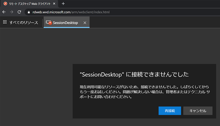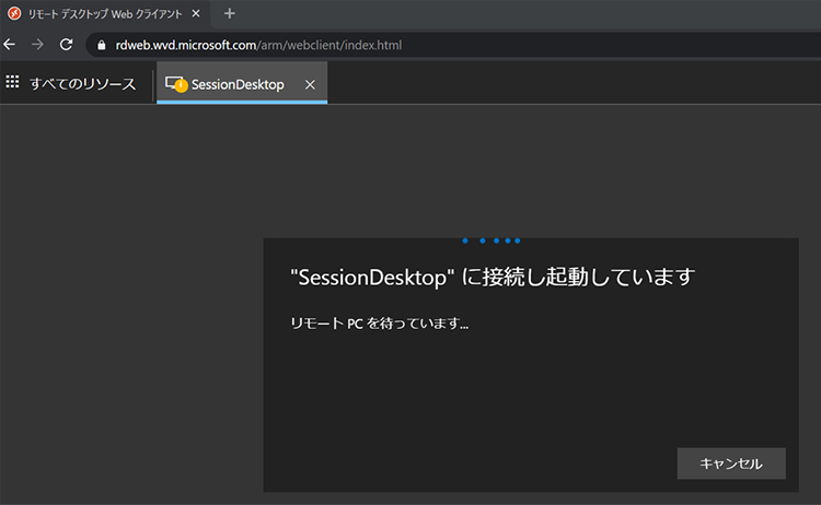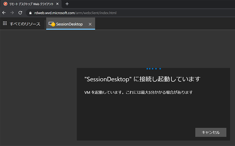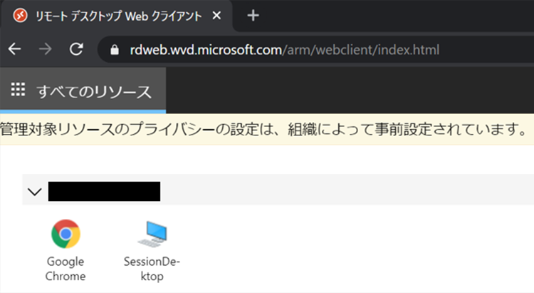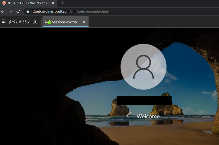 Azure Virtual Desktopへの接続は「ブラウザ」と「Remote Desktop Client」の2種類がありますが、ここではブラウザ経由での接続画面をご紹介します。