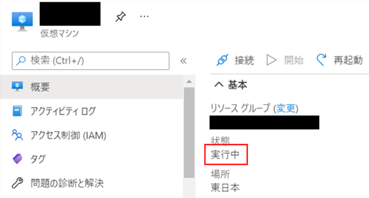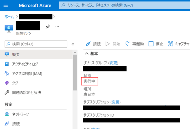 Azure Portalを覗いてみると、電源は「実行中」になっていますね!(当然ですが)