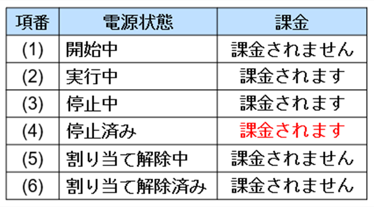 仮想マシンの各状態で、課金の発生有無をまとめた表です。