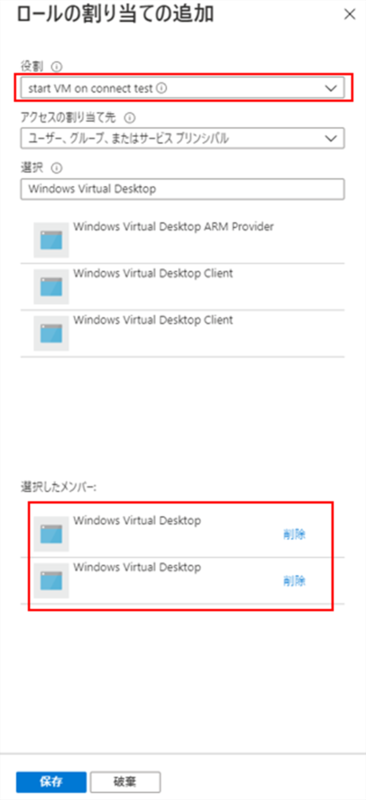 先ほど作成したカスタムロールをクリックして、「Windows Virtual Desktop」を選択します。その後「保存」をクリックします。
