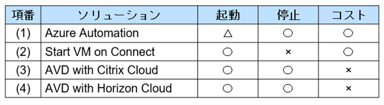 上記の表では、主な評価軸として仮想マシンの起動 / 停止処理の実現可否やコストの有無を挙げています。