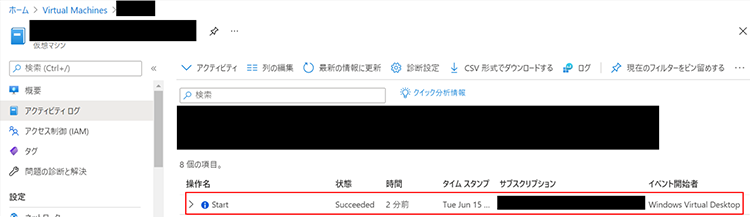 先ほどカスタムロールの権限を与えた「Windows Virtual Desktop」が起動処理を実行しているのが確認できますね!