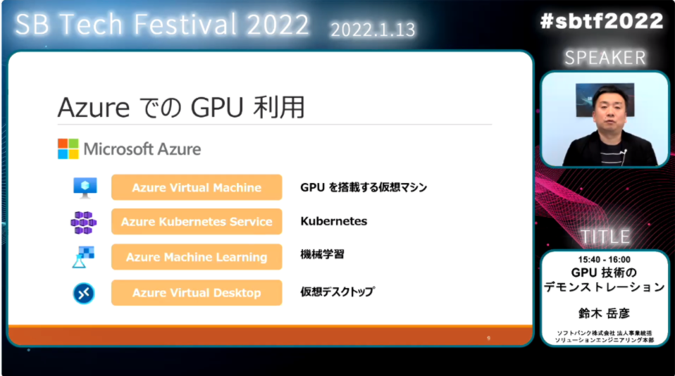 ソリューションエンジニアリング本部の鈴木 岳彦さんはGPUをテーマに講演。Microsoft Azureが提供しているGPUサービスの紹介やデモンストレーションを行いました。