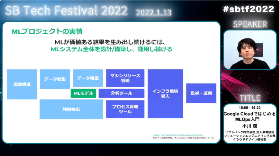 ソリューションエンジニアリング本部の小川潤さんは「Google CloudではじめるMLOps入門」について発表しました。Googleの考えるMLOpsとは機械学習のシステム開発(Dev)とシステム運用(Ops)の統合を目的とする手法です。MLシステムには「継続的な学習・配信」「複数の異なる目標のバランス調整やメンバーとの意思疎通」「信頼とスケーラビリティ」などの課題がありますが、Google Cloudの統合AIプラットフォーム「Vertex AI」を利用することで効果的なMLOpsが実現できるようです。