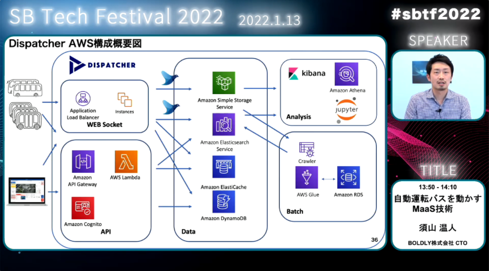 BOLDLY株式会社 CTO 須山温人さんは「自動運転バスを動かすMaaS技術」について発表しました。 BOLDY(ボードリー)はさまざまな地域で自治体と連携した自動運転バスの運航を行っております。講演ではBOLDLYが提供する自動運転車両運行プラットフォーム「Dispatcher」の裏側の技術について詳しい説明が行われました。
