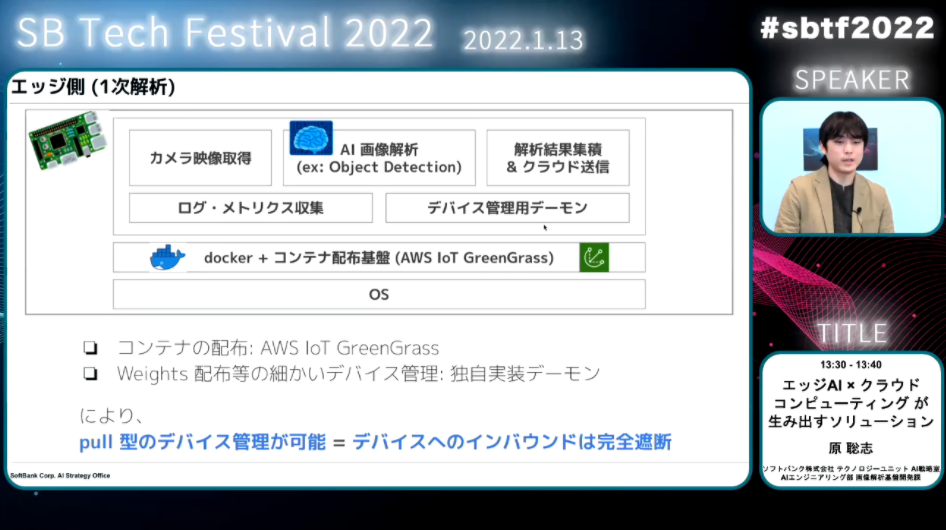 テクノロジーユニット AI戦略室 原聡志さんは「エッジデバイスとクラウドを組み合わせたAI分析」について発表しました。 エッジデバイス側でAI推論を行い、推論結果の二次的な分析結果をクラウド上で行うことで、お互いの特徴を活かしながら、よりスピーディで高精度な分析が可能になるようです。
