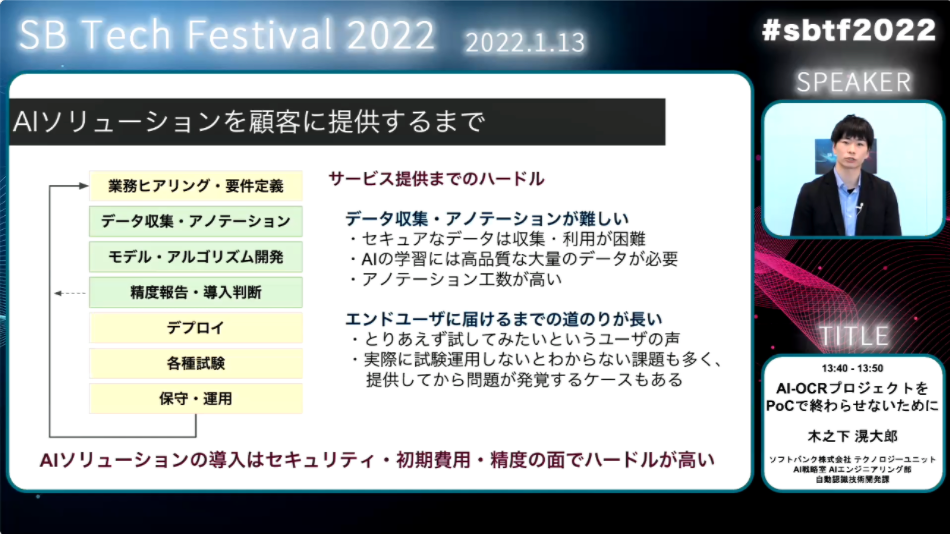 テクノロジーユニット AI戦略室 木之下 滉大郎さんは「AI-OCRプロジェクトをPoCで終わらせないために」というタイトルで、AIを活用したサービスを開発する際の課題と解決策について発表しました。