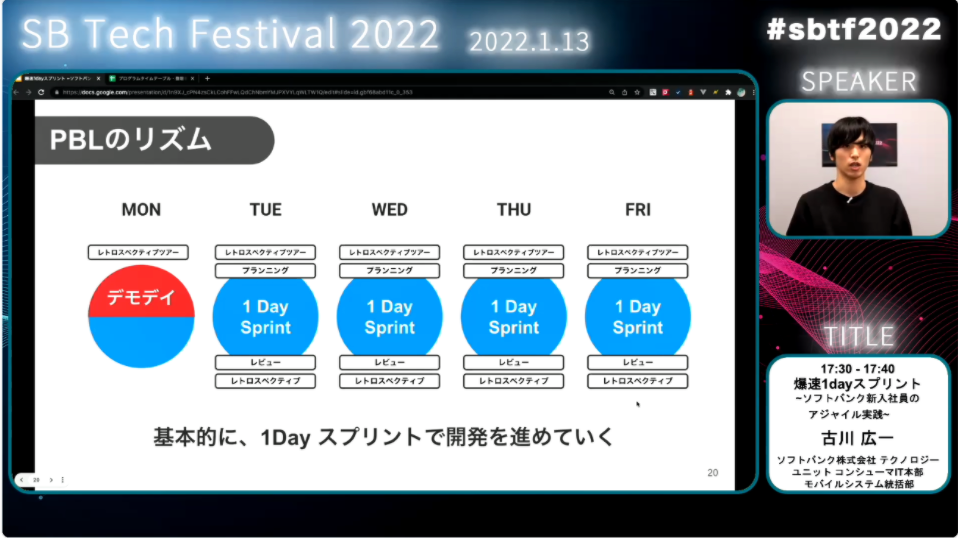 テクノロジーユニット 古川広一さんはソフトバンクの2020年度新入社員研修で行われた問題解決型学習(Project Based Learning、PBL)の取り組みについて発表しました。