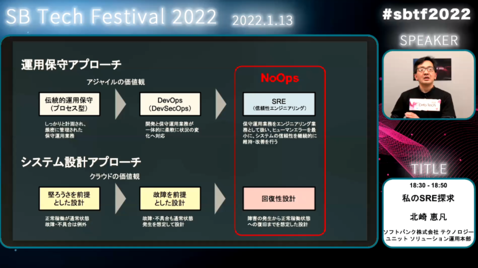 テクノロジーユニット 北崎 恵凡さんは「私のSRE探求」というタイトルで、ネットワーク保守運用現場におけるソフトバンク流のSRE(Site Reliability Engineering)について発表しました。