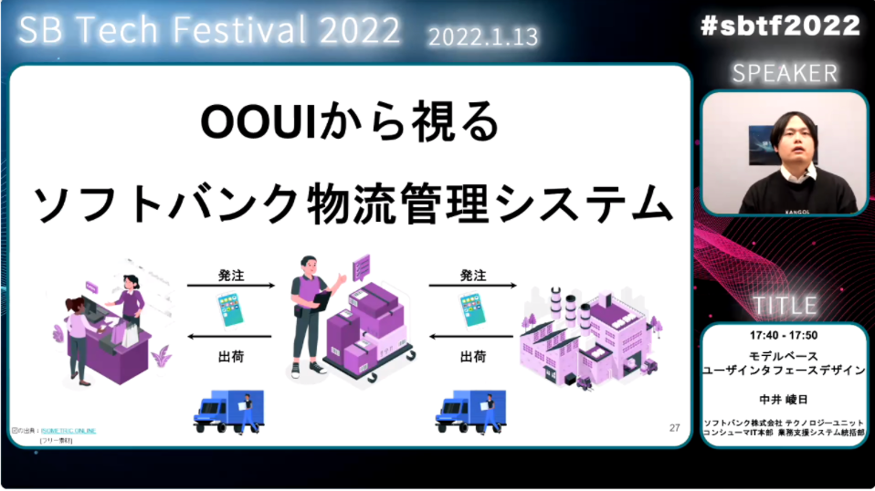テクノロジーユニット 中井 崚日さんは「モデルベースインターフェースデザイン」をテーマに発表し、ソフトバンク社内の物流管理システムを「オブジェクト指向UI(OOUI)」によって改善した事例などを紹介しました。