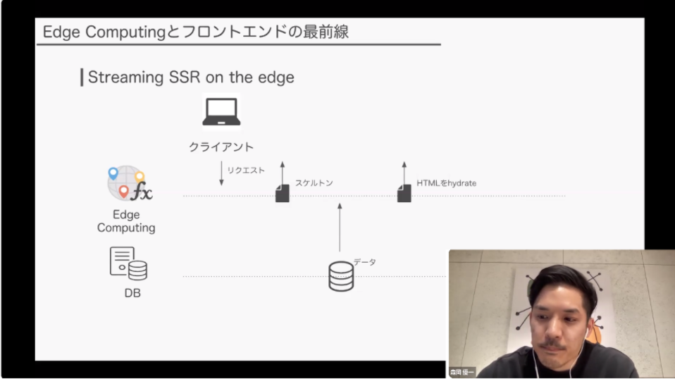 テクノロジーユニット森岡 優一さんは「Webとエッジコンピューティングのこれからについて話そうじゃないか」というタイトルでSSR(Server Side Rendering)のパーソナライズとSSG(Static Site Generator)の高速配信の両方の技術を実現する「Edge Functions」の有用性について発表しました。
