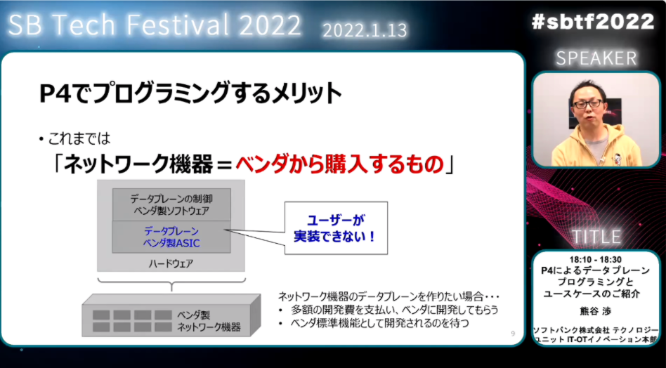 テクノロジーユニット 熊谷 渉さんはオープンソースのデータプログラミング言語「P4(Programming Protocol-Independent Packet Processors)」を活用したユースケースについて発表しました。
