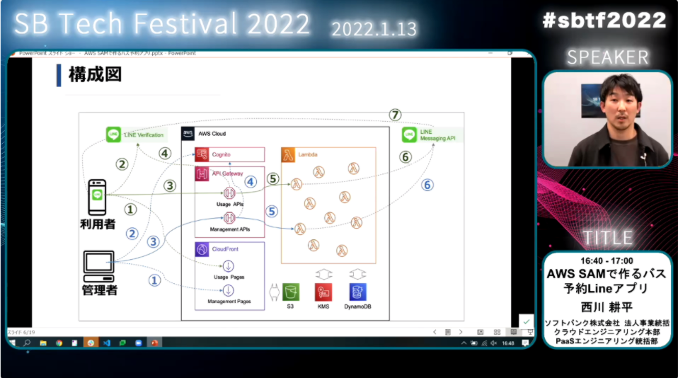 クラウドエンジニアリング本部 西川 耕平さんは「AWS SAMで作るバス予約LINEアプリ」について発表。AWSのサーバーレスサービスにて開発した自動運転バス予約アプリのインフラ構成などを紹介しました。