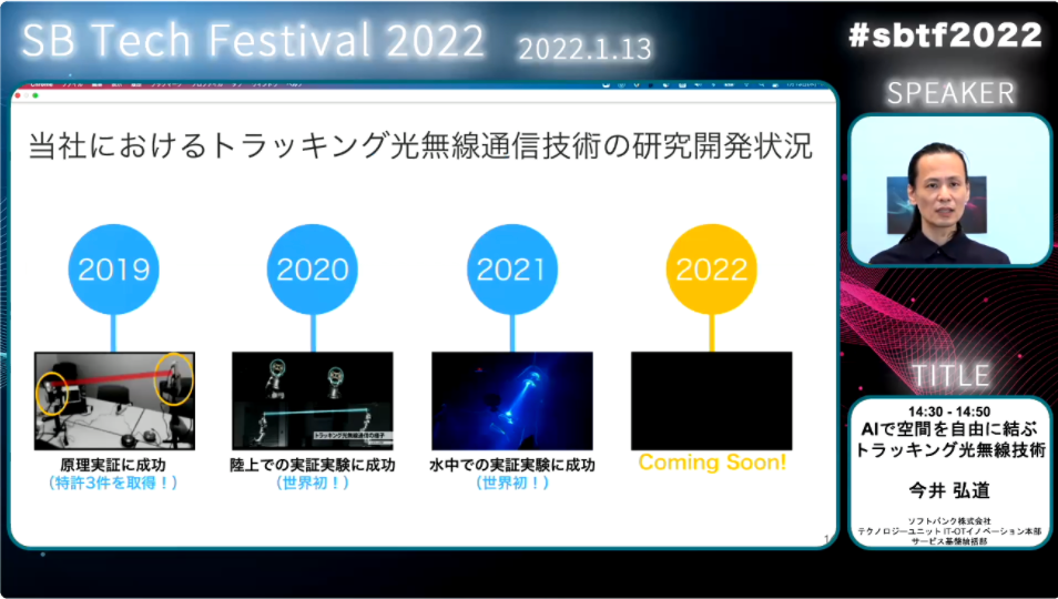 テクノロジーユニット 今井弘道さんは「AIで空間を自由に結ぶトラッキング光無線技術」というタイトルで発表しました。5Gの次の世界「6G」では電波による通信だけでなく、光による通信が重要な技術となっていくようです。光通信は有限資源である電波を節約することができるため、持続可能な社会の実現にも貢献できると今井さんは語り、ソフトバンクが独自開発した画像認識AIによる「トラッキング光無線技術」の取り組みを紹介しました。