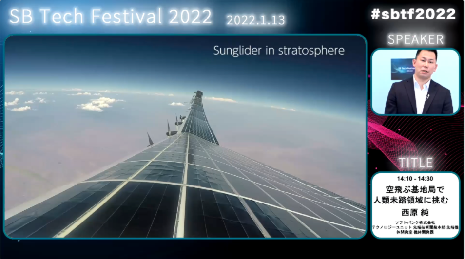 テクノロジーユニットの西原純さんは「空飛ぶ基地局で人類未踏領域に挑む」というタイトルで成層圏を飛行する無人航空機を利用した通信プラットフォーム「HAPS」の取り組みを発表しました。 成層圏に位置する通信プラットフォーム HAPSの無人航空機は太陽光エネルギーを電力として、機体重量も大型航空機の100分の1以下のため、1回のフライトで最大6カ月間の飛行が可能になるようです。化石燃料を利用せずに飛行するため、一般航空機と比較して環境への負荷も抑えることができるようです。
