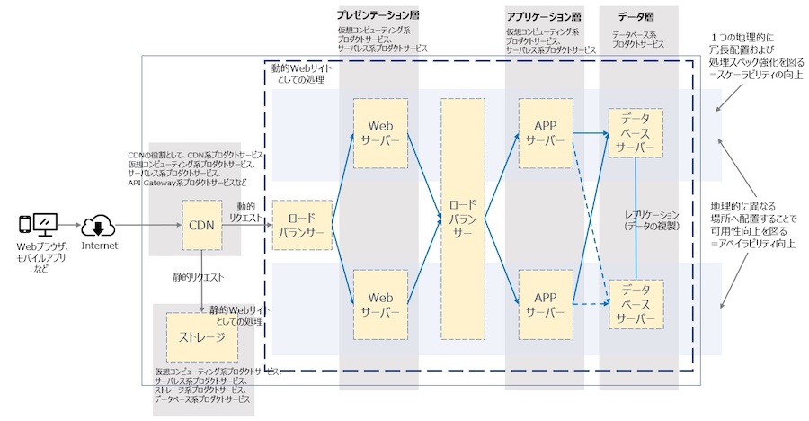 なお、これはWeb3層アーキテクチャではないですが、静的Webサイトとしての対処であれば、CDN(Content Delivery Network)およびストレージの組み合わせで実現することができます。CDNは仮想コンピューティング系プロダクトサービス、 サーバレス系プロダクトサービス、 API Gateway系プロダクトサービス、 CDN系プロダクトサービス、ストレージは仮想コンピューティング系プロダクトサービス、サーバレス系プロダクトサービス、ストレージ系プロダクトサービス、データベース系プロダクトサービスなどで実現できます。