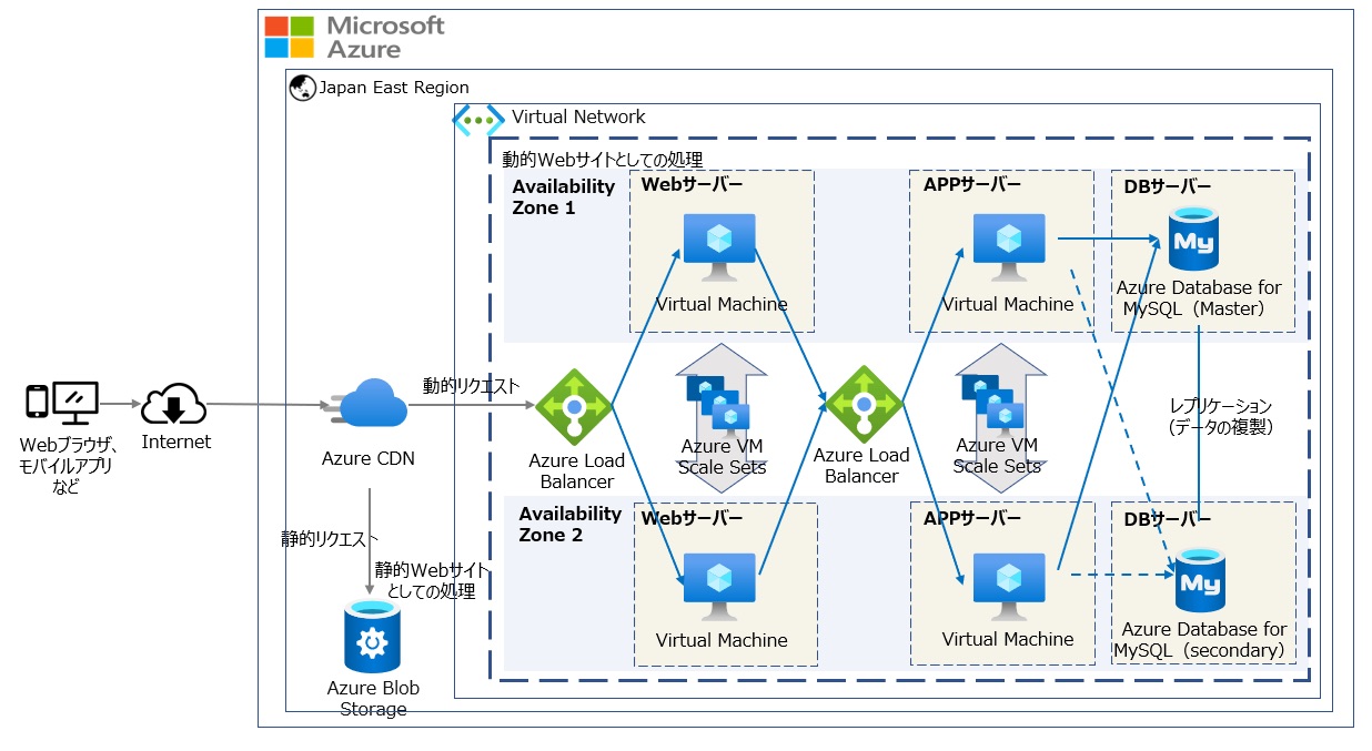Azureは可用性に特化したさまざまなWebアプリケーションのサンプルやベストプラクティス情報がいくつかあります。今回はベーシックなWeb3層アプリケーションを使用していますが、マルチリージョン、あるいはマルチゾーンで展開する場合、Azure CDNより後にTrafficManagerを配置することを推奨しています。TrafficManagerによる常時ヘルスチェックで死活監視しつつ、有事の際は切り替えするというアプローチです。構築する場合、WebサーバはVirtual Machine、データベースはAzure Database for MySQL、ロードバランサはAzure Load Balancer、コンテンツ配信はAzure CDN、オブジェクトストレージはAzure Blob Storageを使います。